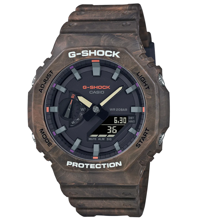 Casio G-Shock GA-2100 Использована технология Carbon Core Guard – электронный модуль часов помещен не в стальной, а карбоновый корпус, на котором сверху закреплен пластиковый кожух. Применение данной технологии позволяет получить достаточно тонкий корпус.