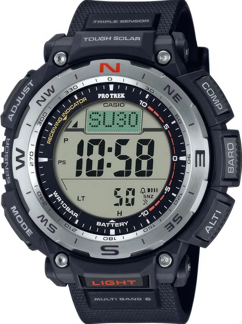 Хронограф, Будильник, Таймер, Мировое время, Компас, Барометр / Альтиметр, Термометр, 12/24 формат отображения времени, Радиосинхронизация, Данные о восходе/закате солнца, Уровень заряда батареи |